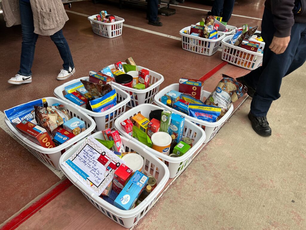 Total giving this month was $1,009, which will ensure the LEFD pantries stay full for a while. The fire department received 18 laundry baskets with items they needed, including: peanut butter, crackers, pancake mix and syrup, tortilla chips, granola bars, oatmeal, honey, cooking spray, assorted snacking nuts, spaghetti sauce, cereal, olive oil, coffee, pasta, sandwich/storage/freezer bags, foil, plastic wrap, and parchment paper.